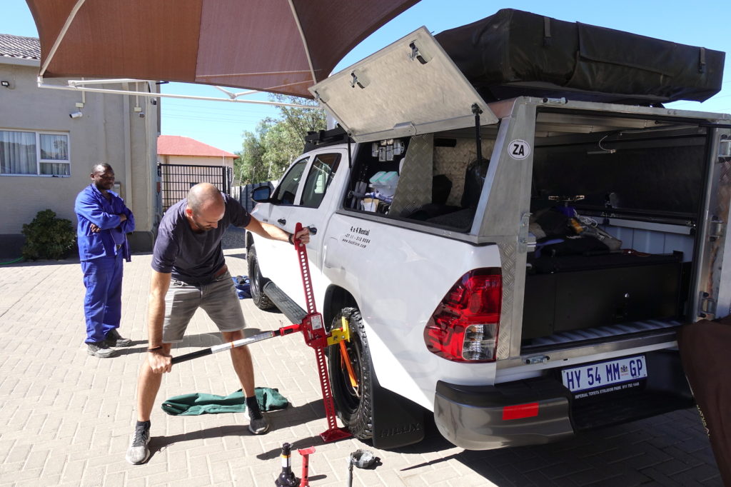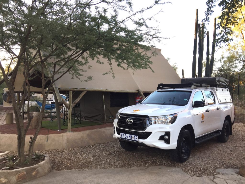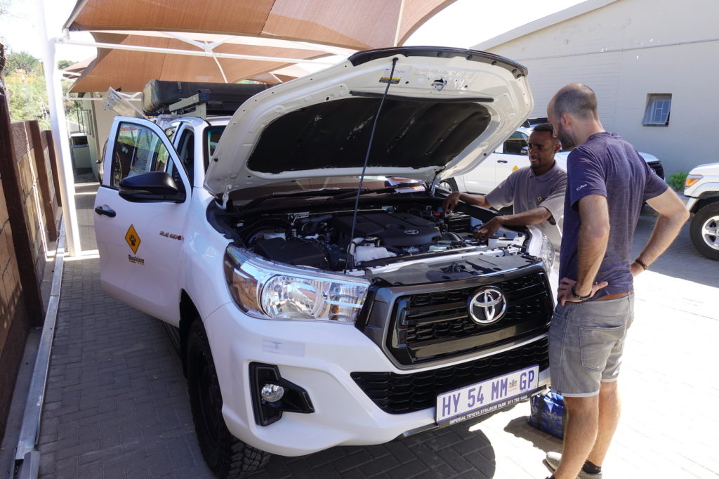 Ursprünglich wollten wir zu einem günstigeren Anbieter, doch langsam beginnt hier in Namibia die Saison und da wir erst vor 3 Wochen gebucht haben, waren schon viele Camper vermietet. Schlussendlich sind wir dann aber doch froh, bei Bushlore gelandet zu sein. Die Ausrüstung ist richtig toll und der Toyota Hilux hat erst 3800 km drauf, also quasi nagelneu. Zudem erlaubt dieser Anbieter die Fahrt auf sämtlichen Wegen inklusive Wasserdurchquerungen.