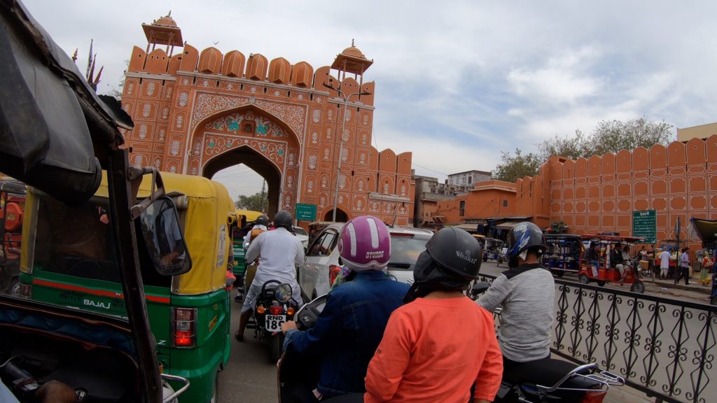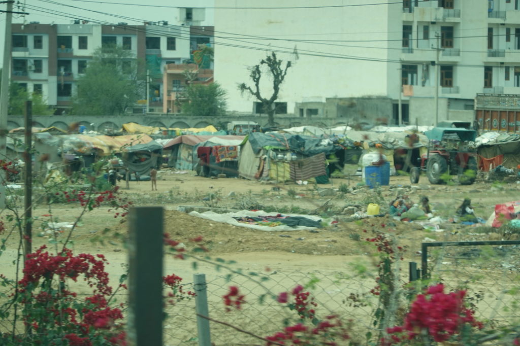Nach 5 Stunden kommen wir in Jaipur an. Mit über 3 Millionen Einwohnern ist es die größte Stadt in Rajasthan. Im Randgebiet fahren wir an sehr einfachen Behausungen vorbei.