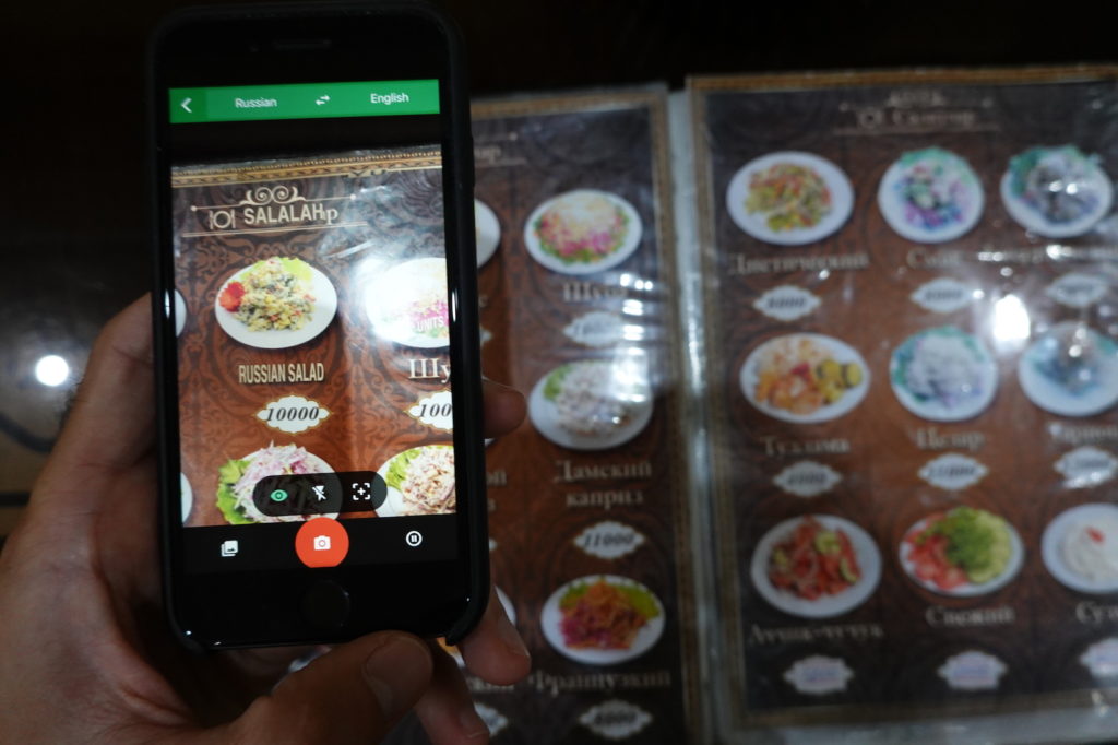 Bei der Wahl aus der Speisekarte nutzen wir eine App, denn nichts ist in englisch beschrieben. Wie auch hier in einem Restaurant zum Mittagessen.