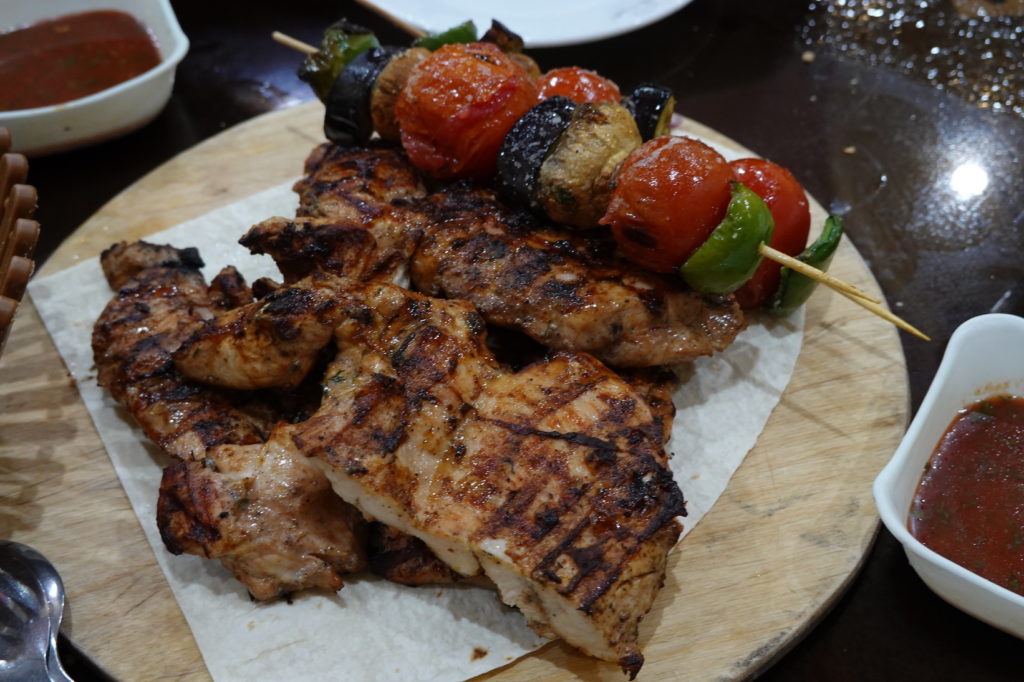 Wir bestellen Salat. Brot bekommt man immer dazu. Zudem mal wieder gegrilltes Fleisch – vegetarische Optionen gibt es außer einem Salat sowieso nicht. Wir zeigen auf das Bild mit dem gegrillten Hähnchenfleisch und die 100g daneben. Dabei zeigen wir 2 Finger, denn wir möchten 200g bestellen.