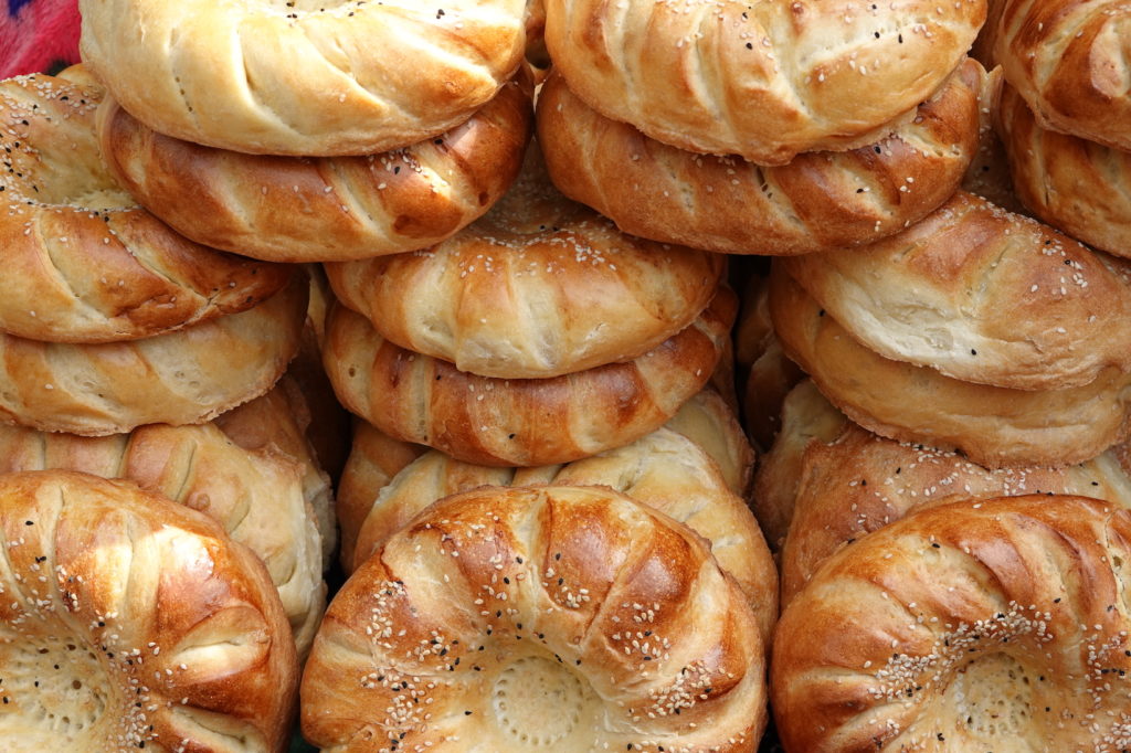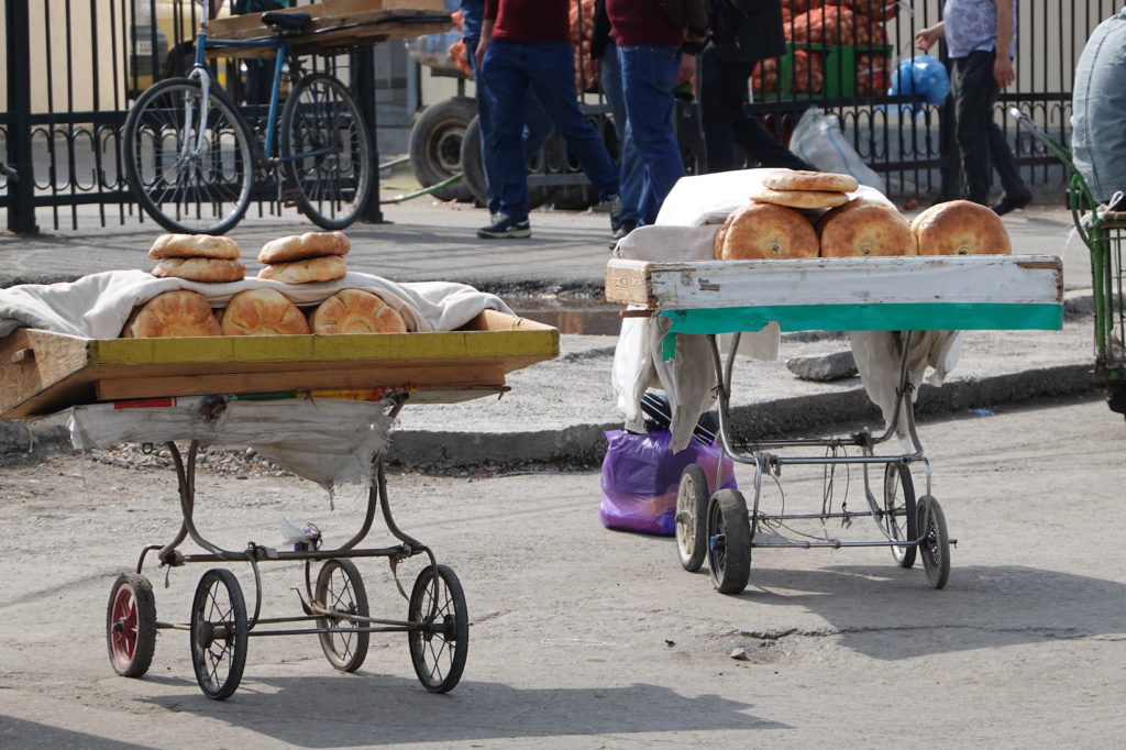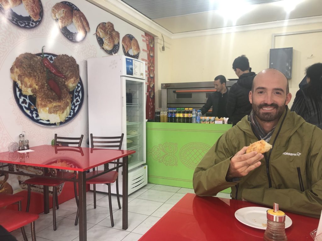 Um die Ecke gibt es einen kleinen Laden, der frisch gebackene Blätterteigtaschen verkauft. Wir wählen die mit Kartoffeln- und Käse-Füllung. Sehr lecker und mit 20cent richtig günstig. Unser tägliches Frühstück in Tashkent.